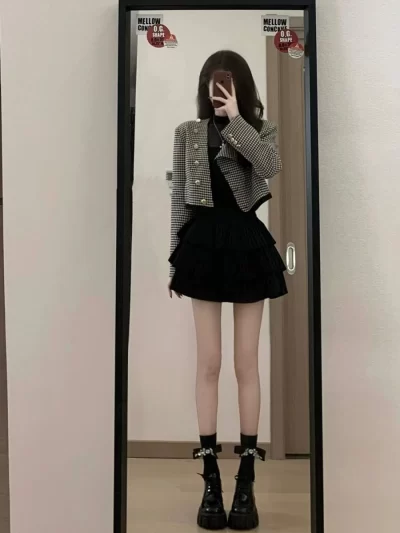 [若丽娜]高级感气质网红御姐职业炸街小香风穿搭千鸟格外套短裙