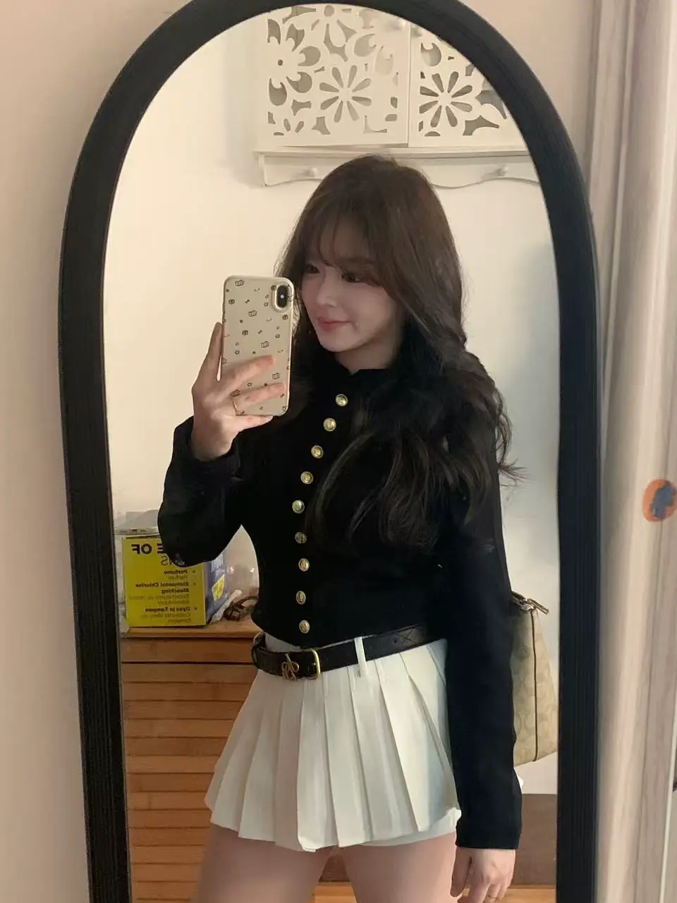 东京原创霜海39cm狗短格裙套装,以经典JK制服的青春基因碰撞辣妹风细节,重塑校园与街头交融的穿搭美学。格裙采用39cm超短“狗短”长度,利落不压身高,对小个子尤其友好;百褶密褶工艺灵动显瘦,每一步都摇曳生姿。配套白色衬衫融入弹力收腰设计,勾勒腰线,打破传统制服的直筒刻板。