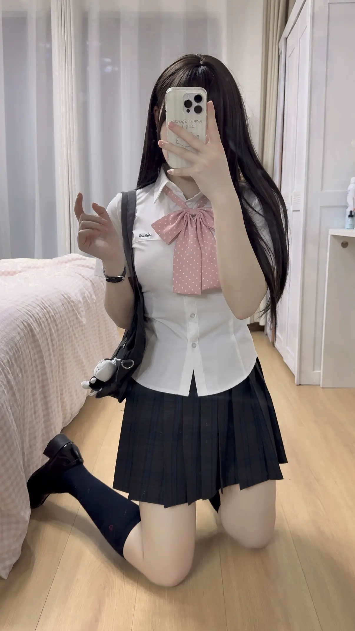 东京原创霜海39cm狗短格裙套装,以经典JK制服的青春基因碰撞辣妹风细节,重塑校园与街头交融的穿搭美学。格裙采用39cm超短“狗短”长度,利落不压身高,对小个子尤其友好;百褶密褶工艺灵动显瘦,每一步都摇曳生姿。配套白色衬衫融入弹力收腰设计,勾勒腰线,打破传统制服的直筒刻板。