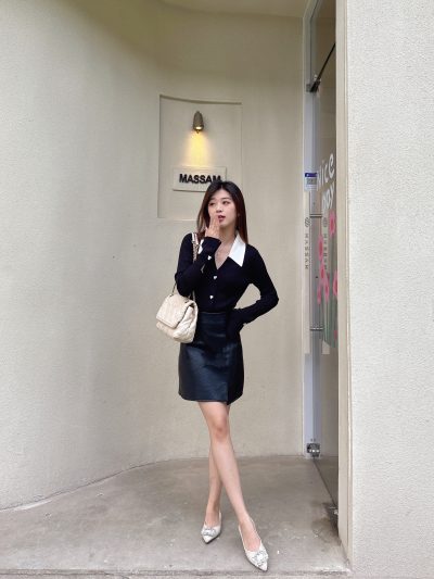 [DPLAY]春装通勤黑色针织上衣法式修身撞色polo领针织衫别致外套