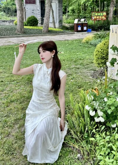 pinkpo 玉白兰芳 新中式刺绣拼接裙摆短袖清冷感连衣裙