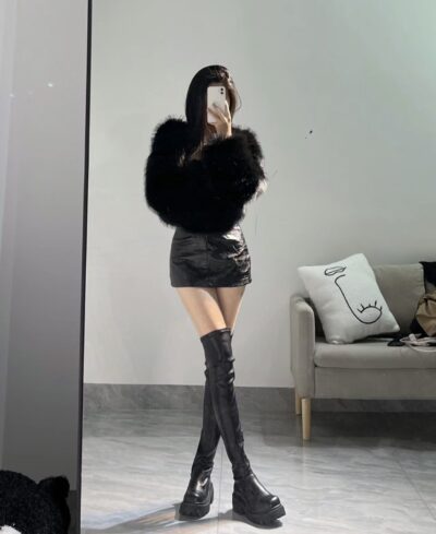 [Qiqi齐齐]黑色褶皱小皮裙秋季半身裙韩版高腰紧身pu皮包臀性感一步裙冬